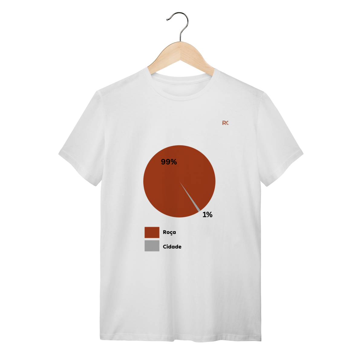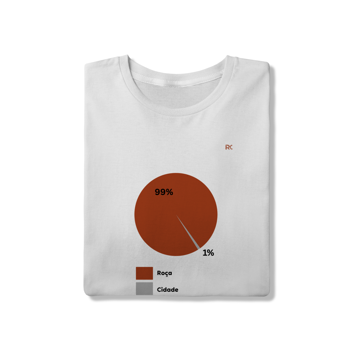 A Camiseta Quality Branca – 99% Roça, 1% Cidade traduz em forma de humor a essência de quem nasceu e vive pelo campo, mostrando o quanto a roça domina o coração, ela representa o orgulho e a simplicidade de quem prefere o cheiro da terra ao da cidade grande.