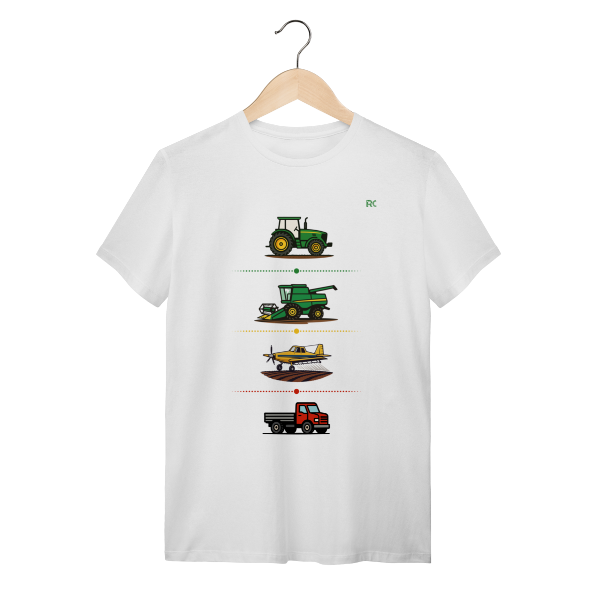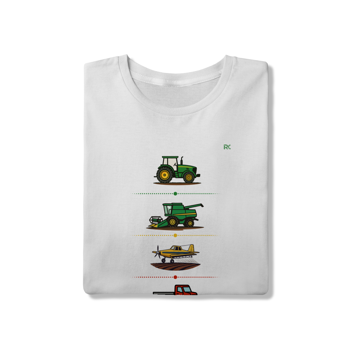 A Camiseta Quality Branca – Potência que move o campo homenageia o maquinário que faz o agro acontecer, da lavoura ao transporte, do chão ao ar.